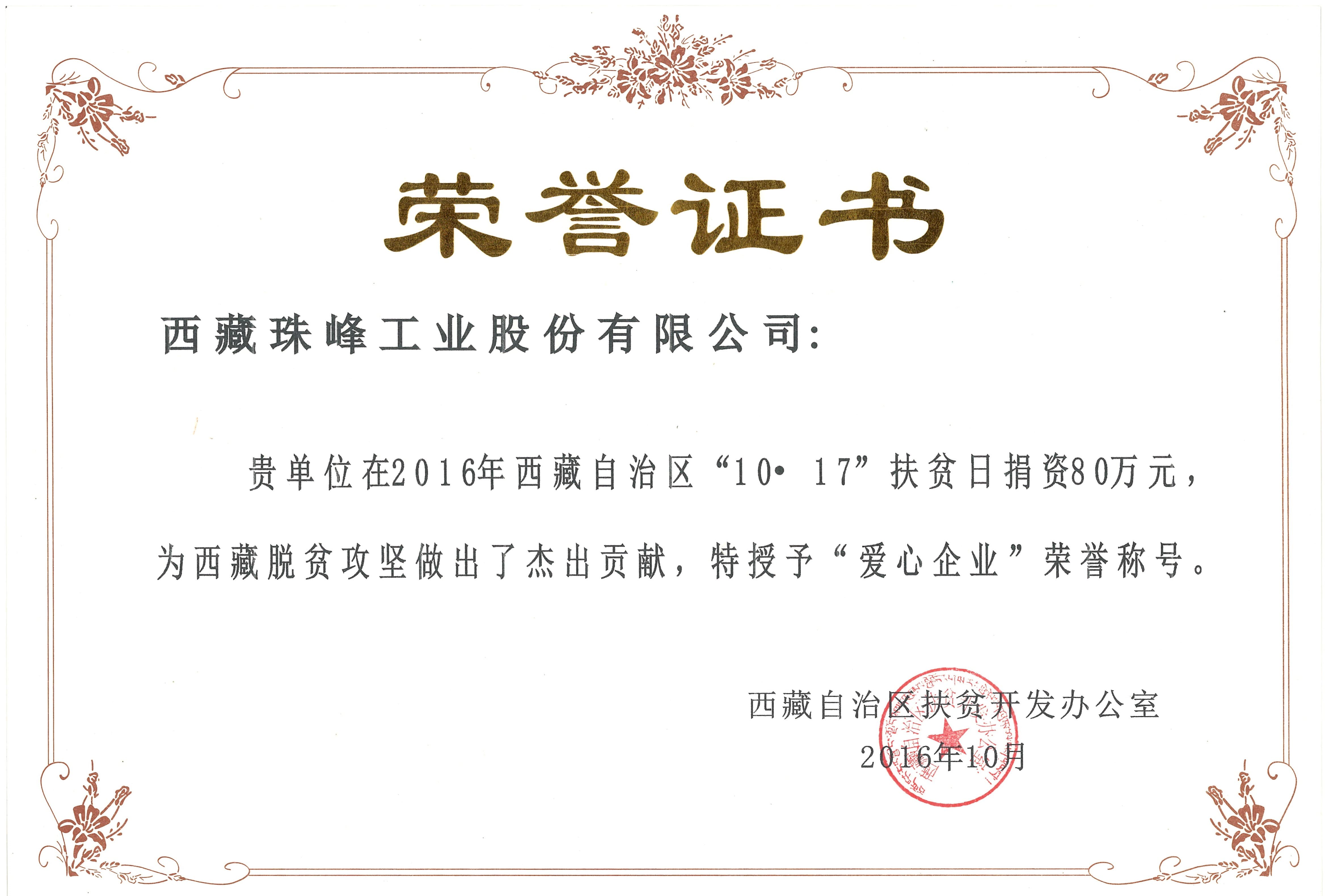 西藏自治區(qū)授予“愛心企業(yè)”稱號